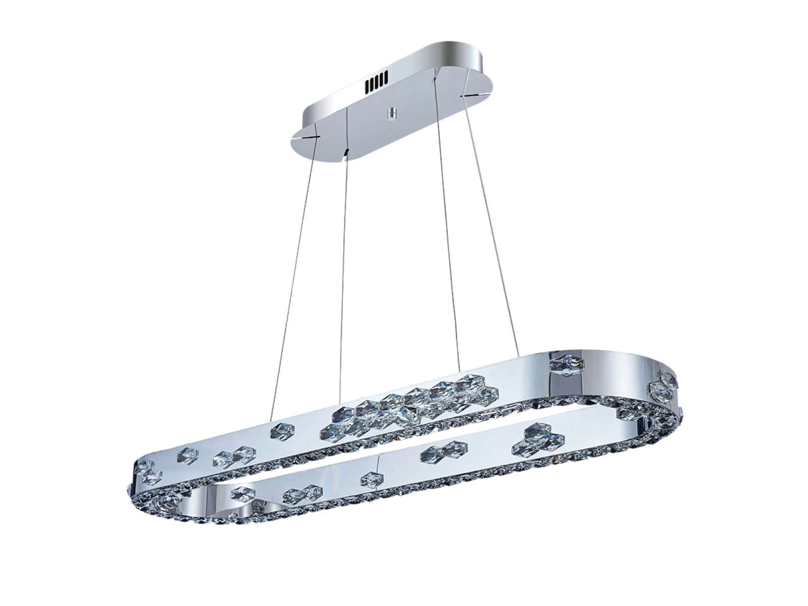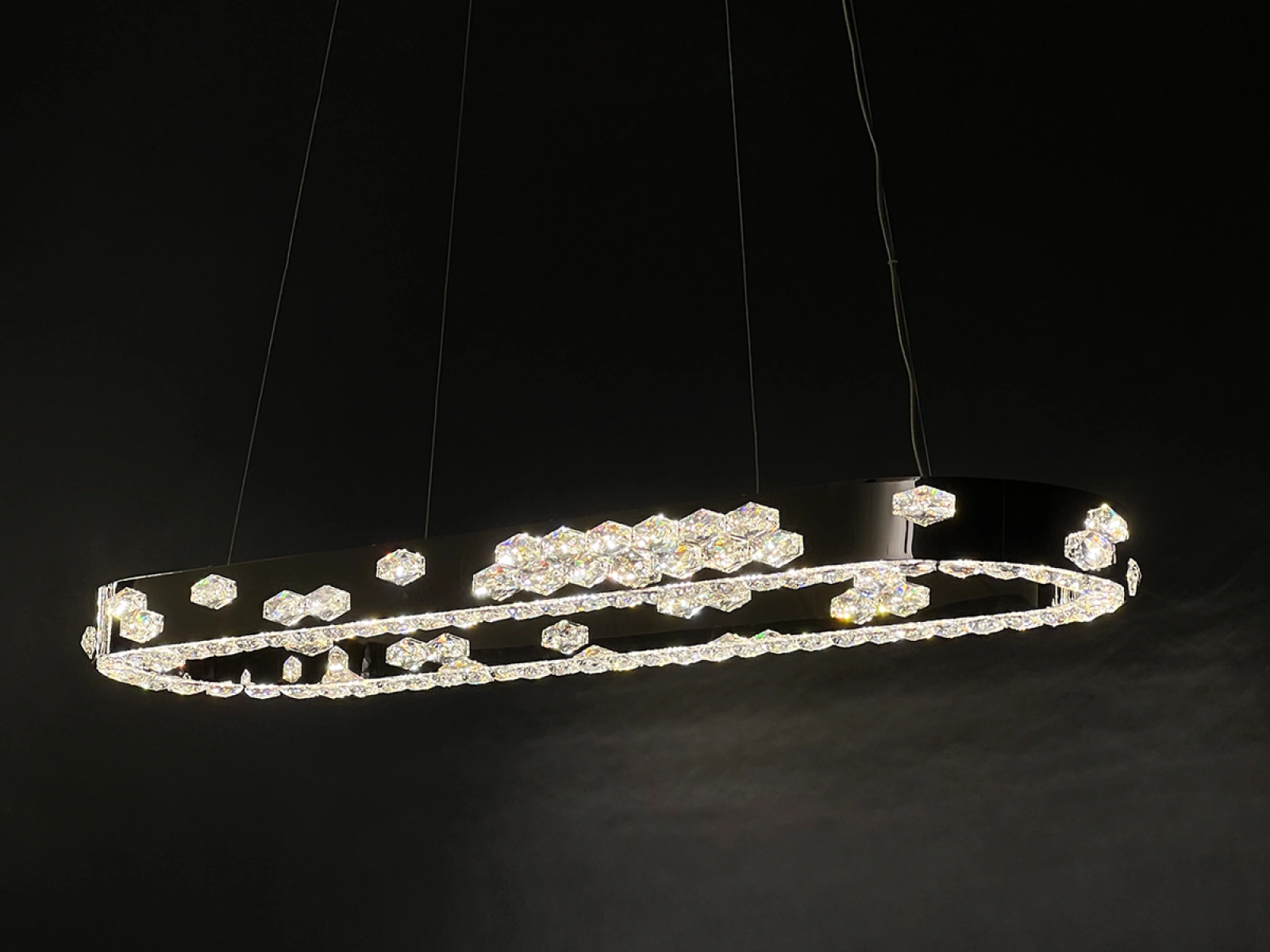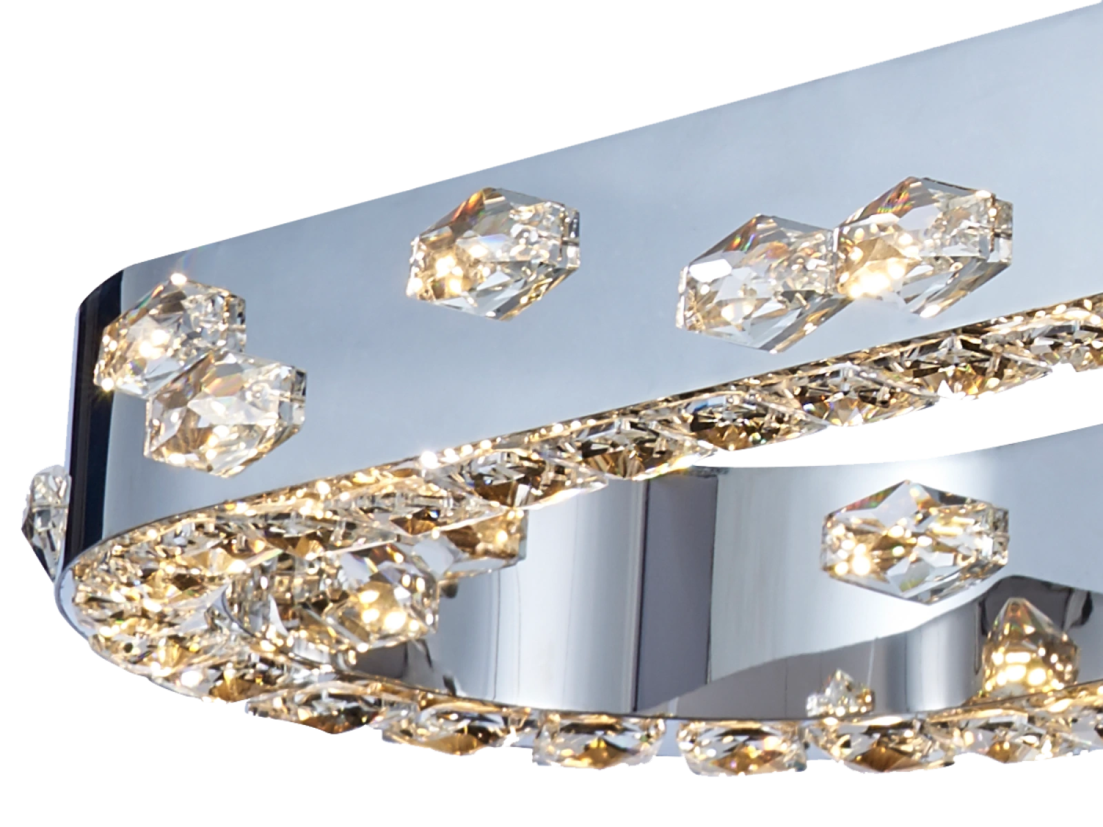 Corpul de iluminat este fabricat din metal rezistent din oțel inoxidabil cu finisaj cromat, în timp ce designul său este completat de cristale tăiate cu precizie pentru a promova reflectarea și refracția luminii. Tehnologia de prelucrare garantează stabilitatea materialului și păstrarea proprietăților estetice.