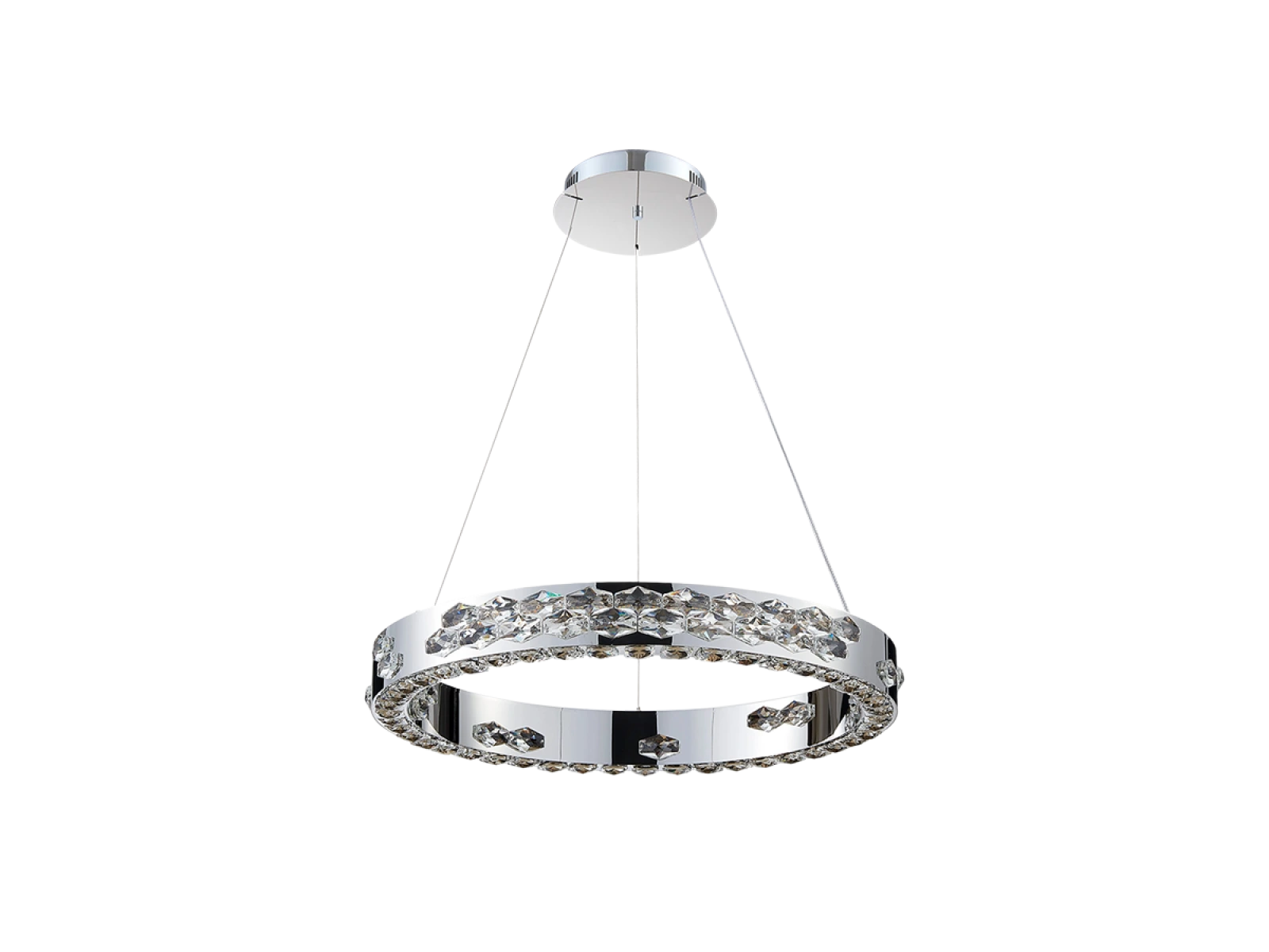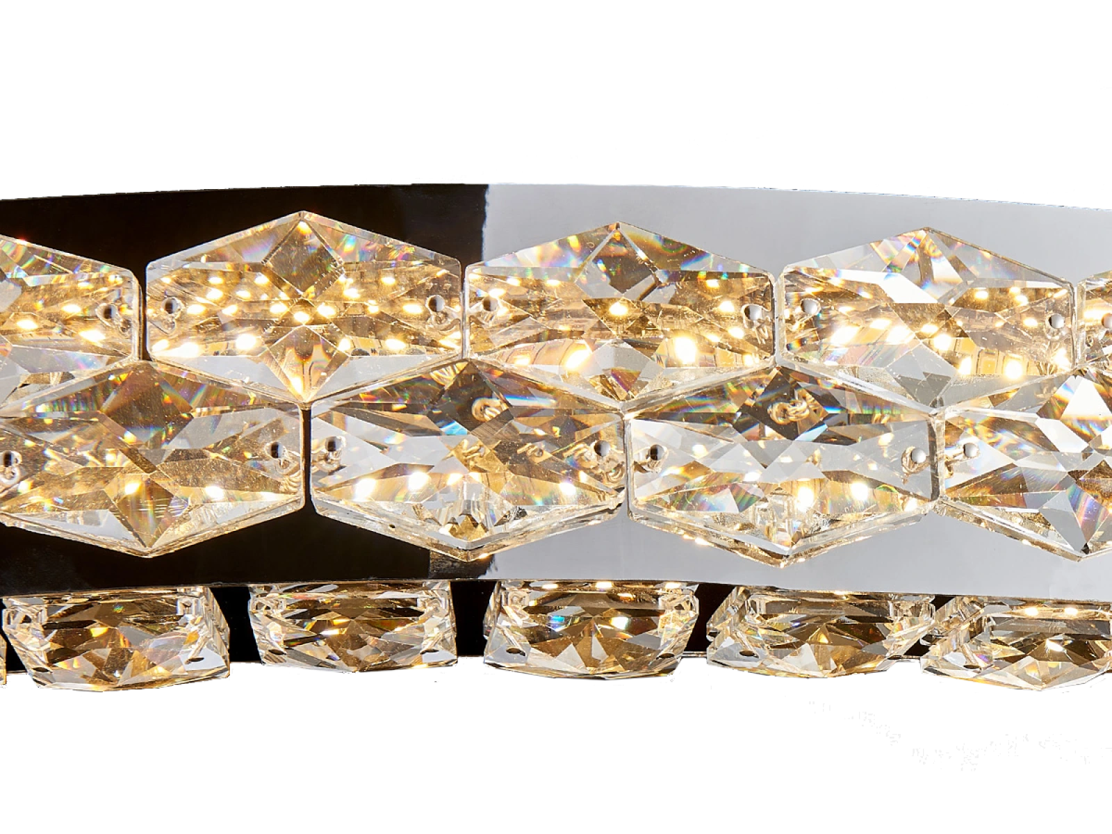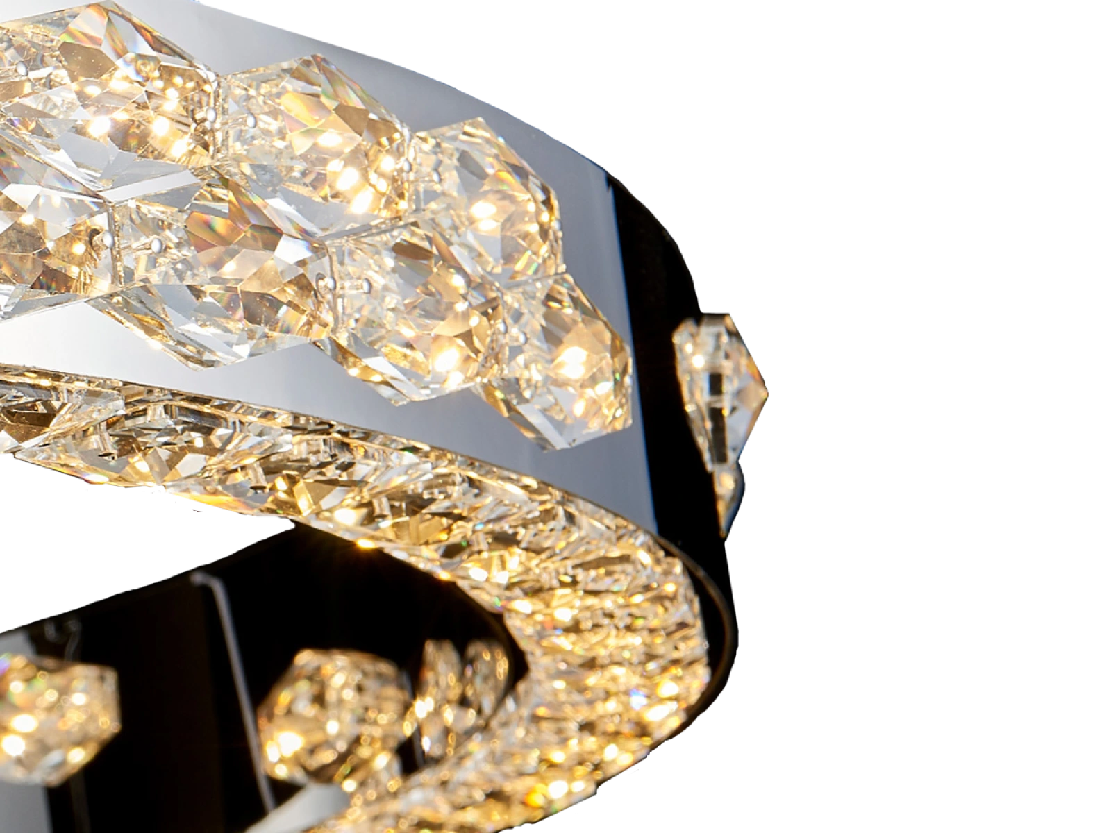 Baza corpului de iluminat este alcătuită din metal din oțel inoxidabil de înaltă calitate cu finisaj cromat, completat de cristale tăiate în detaliu care accentuează efectul luminos. Datorită tehnologiei avansate de prelucrare, materialul își păstrează stabilitatea și aspectul.