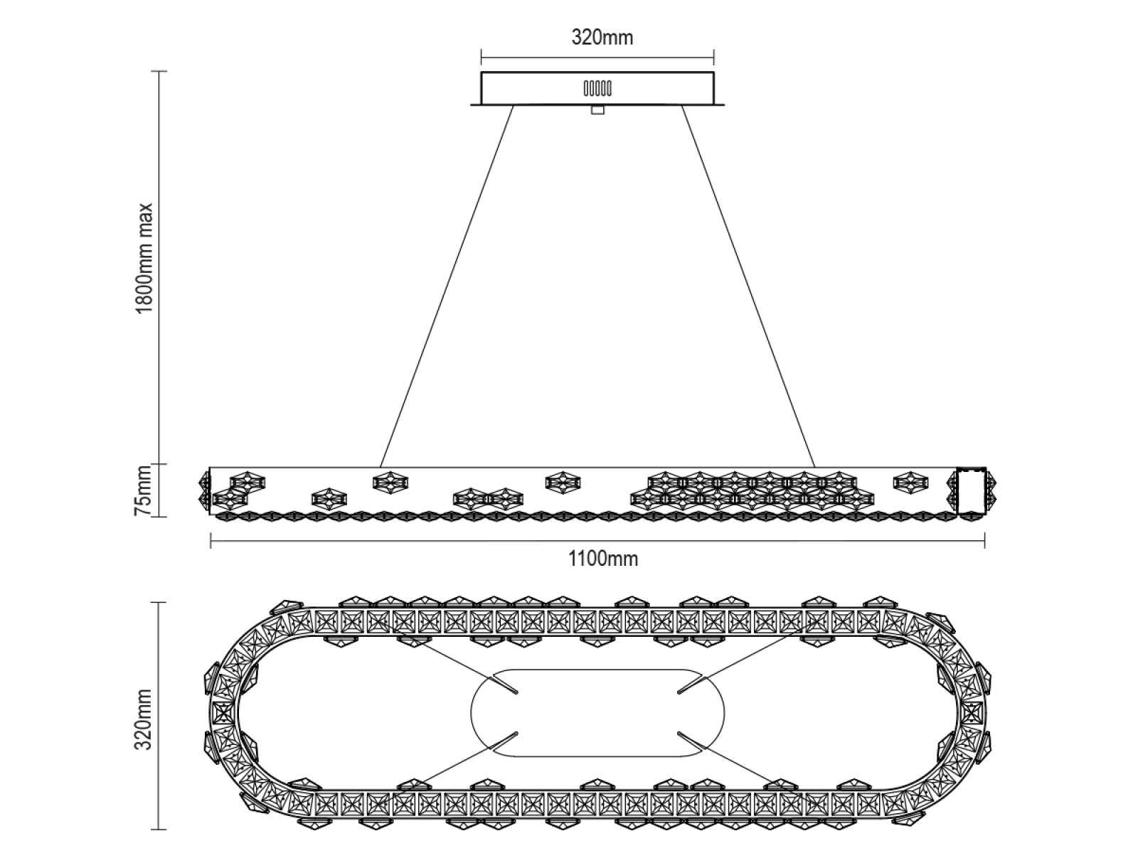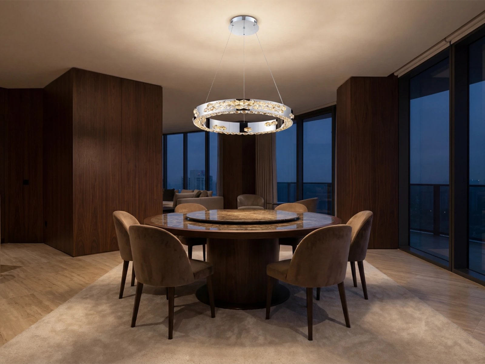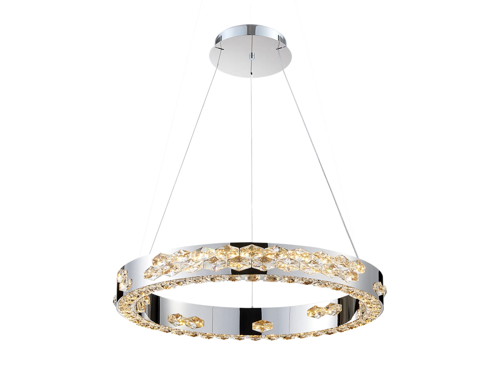 Baza corpului de iluminat este alcătuită din metal din oțel inoxidabil de înaltă calitate cu finisaj cromat, completat de cristale tăiate în detaliu care accentuează efectul luminos. Datorită tehnologiei avansate de prelucrare, materialul își păstrează stabilitatea și aspectul.