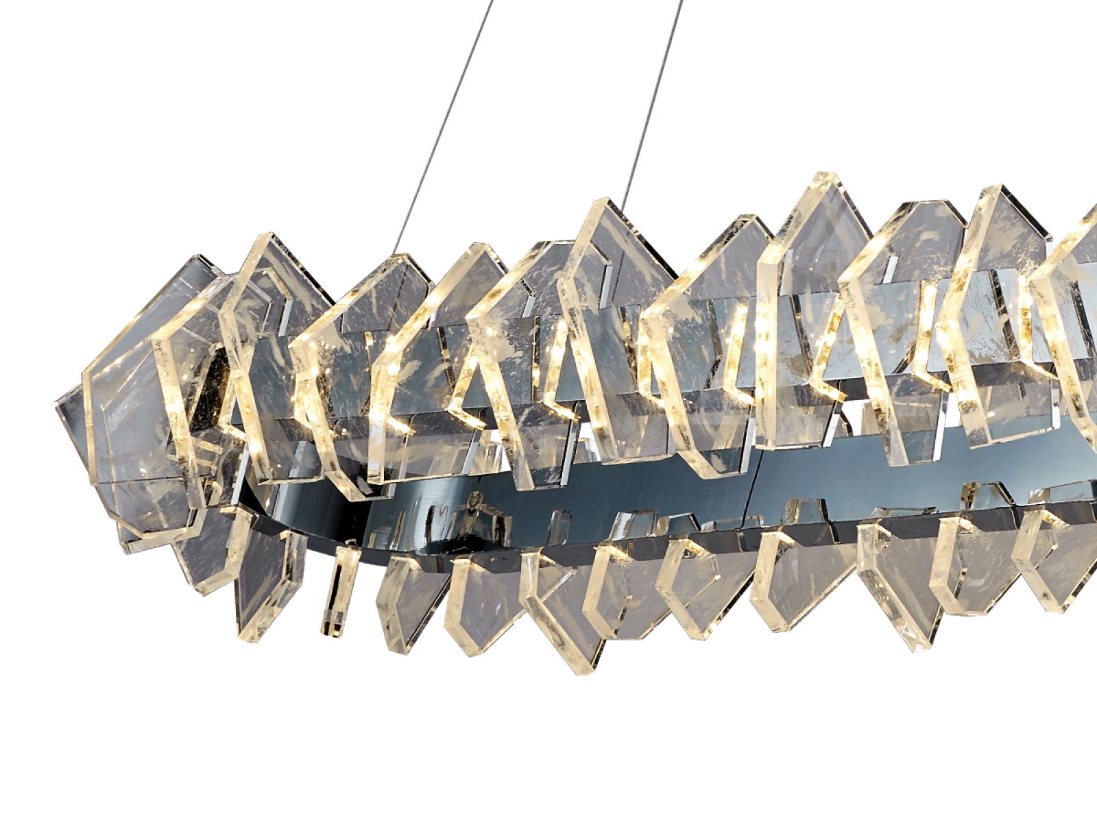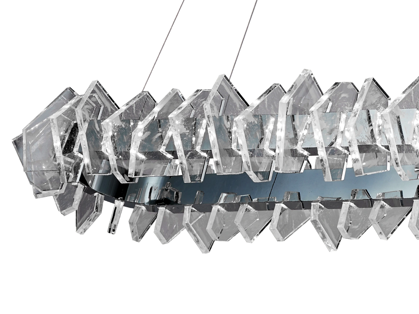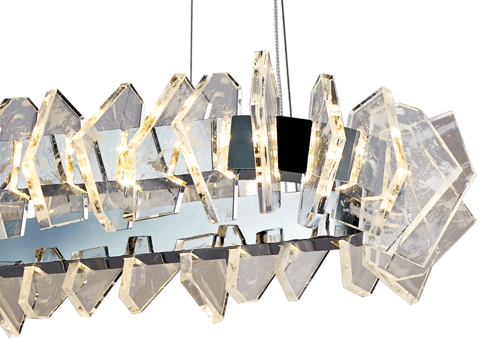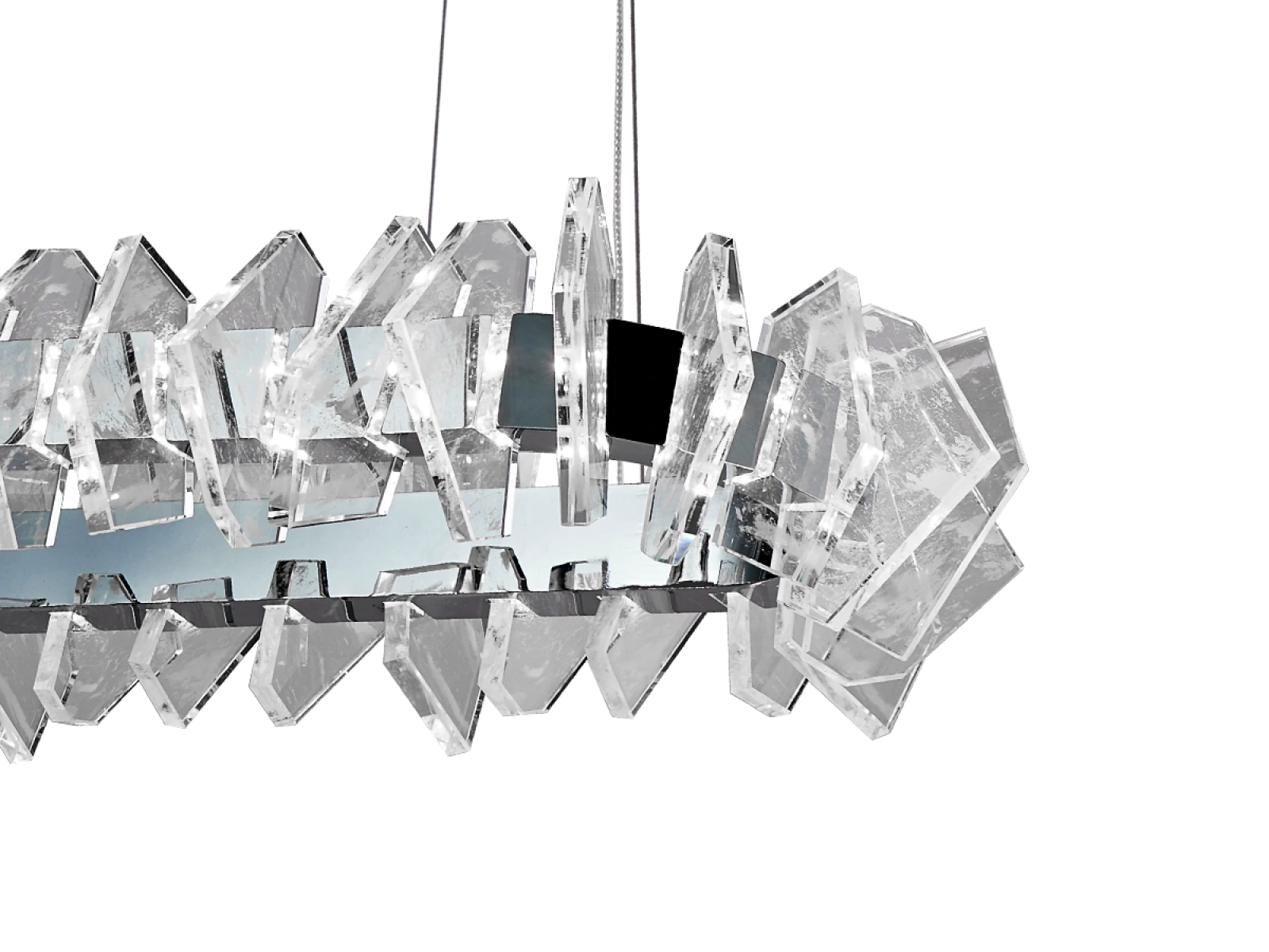 Construcția este realizată din oțel de înaltă calitate cu finisaj cromat și completată de elemente de cristal originale, tăiate cu precizie, care asigură refracția și reflectarea intensă a luminii. Rezultatul este o ambianță luminoasă luxoasă, cu un efect decorativ distinctiv, care va sublinia caracterul interioarelor moderne și reprezentative.