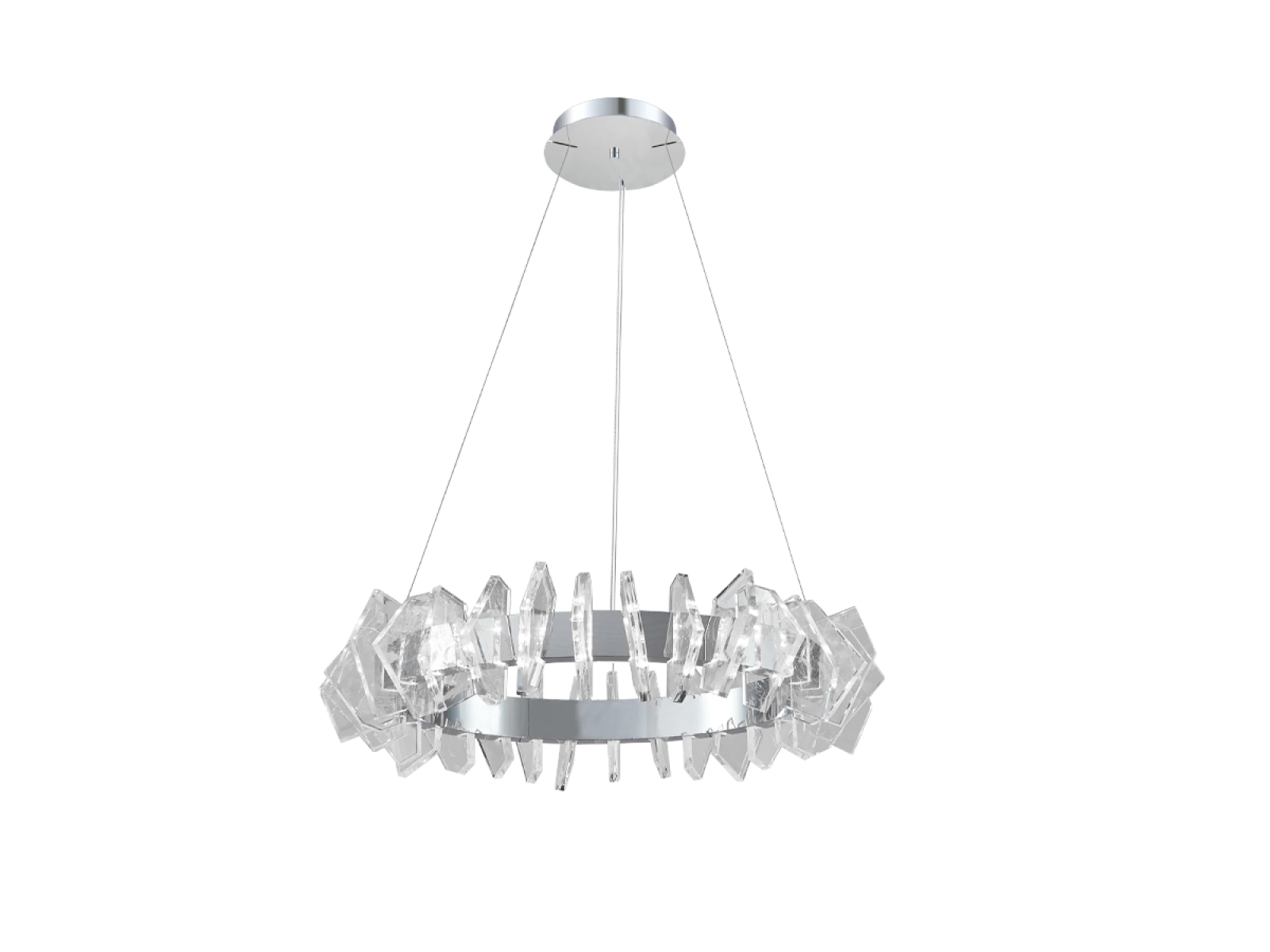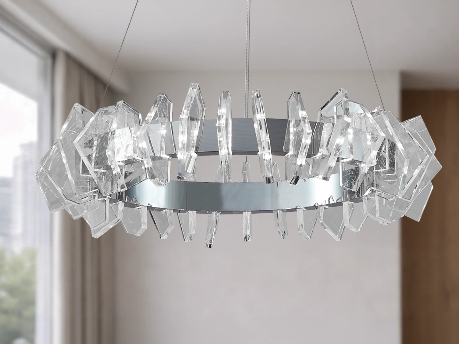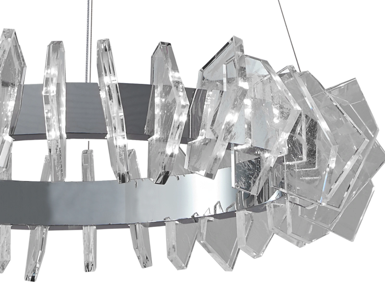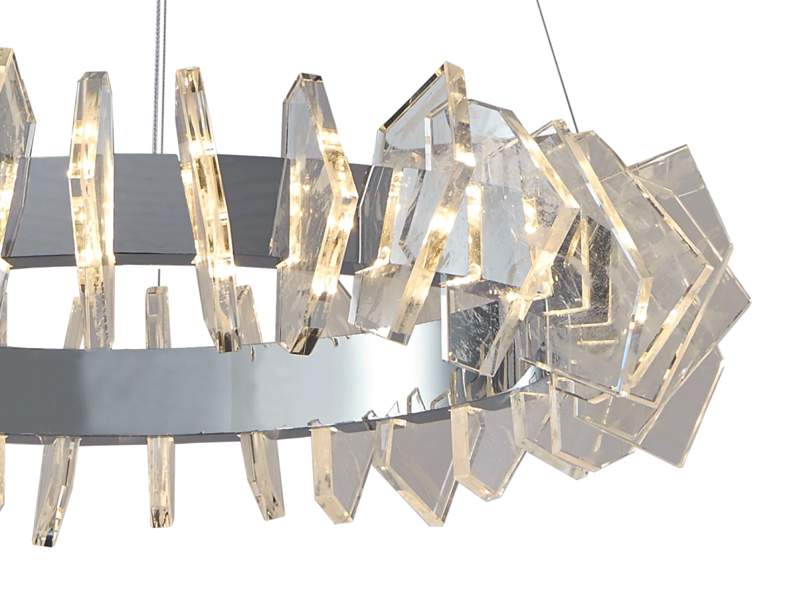 Construcția este realizată din oțel de înaltă calitate cu finisaj cromat și completată de elemente de cristal originale, tăiate cu precizie, care asigură refracția și reflectarea intensă a luminii. Rezultatul este o ambianță luminoasă luxoasă, cu un efect decorativ distinctiv, care va sublinia caracterul interioarelor moderne și reprezentative.