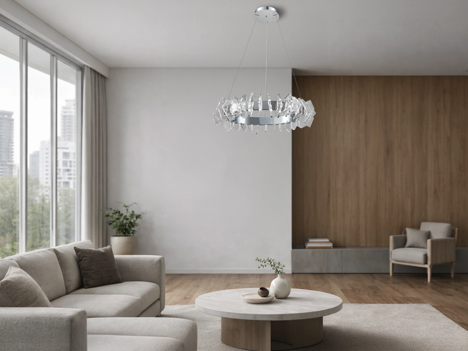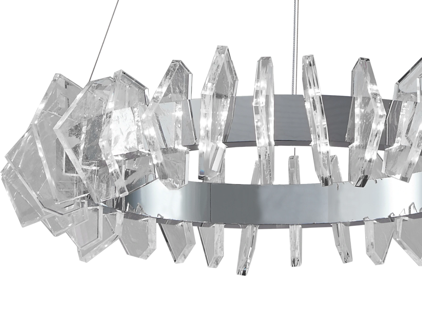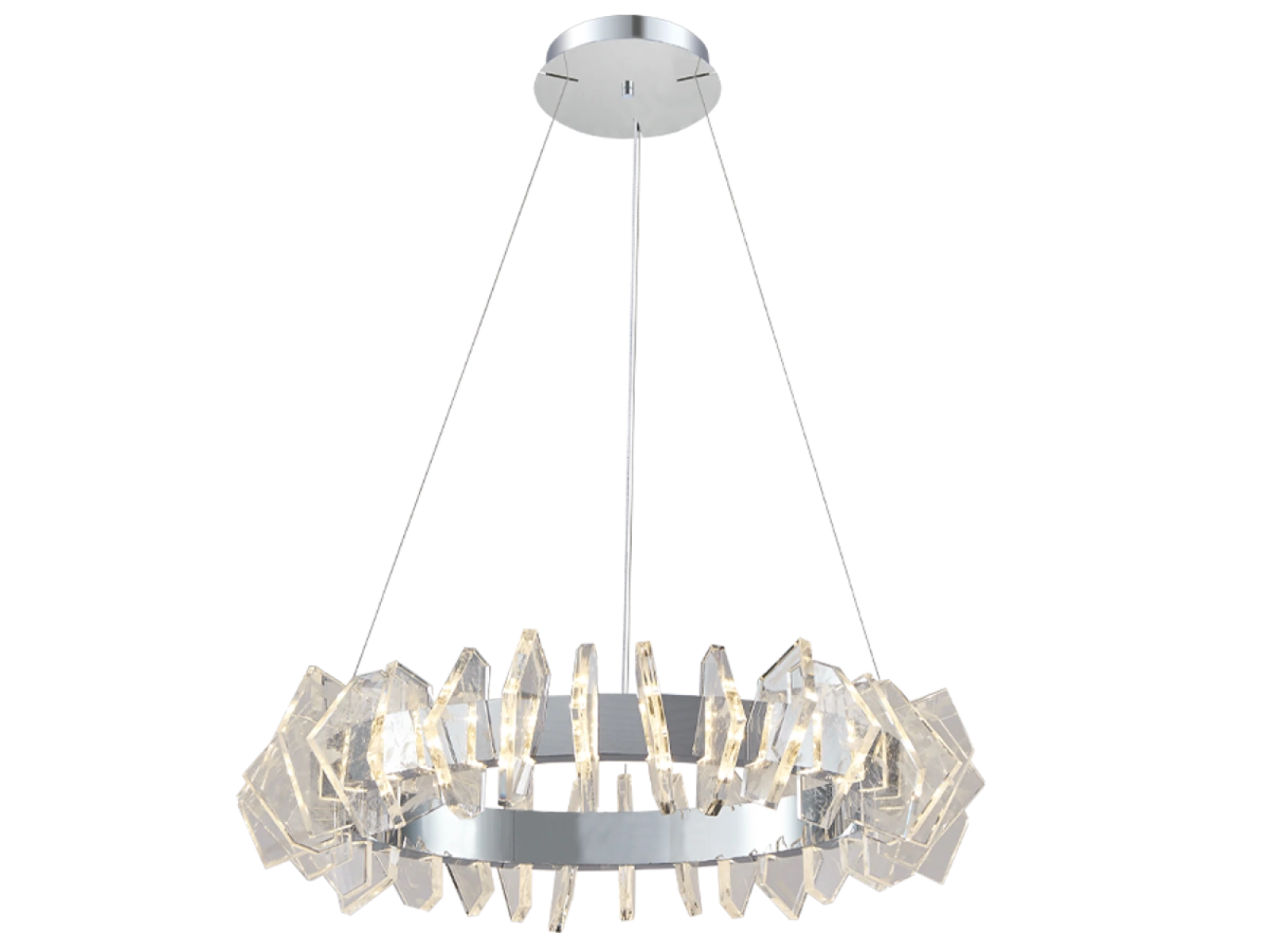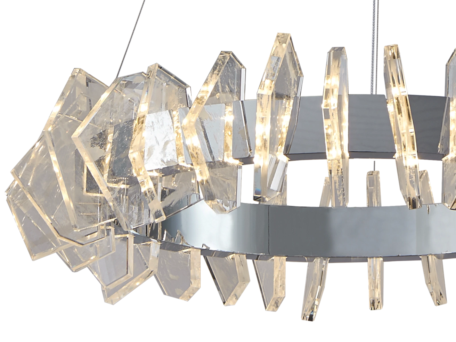 Construcția este realizată din oțel de înaltă calitate cu finisaj cromat și completată de elemente de cristal originale, tăiate cu precizie, care asigură refracția și reflectarea intensă a luminii. Rezultatul este o ambianță luminoasă luxoasă, cu un efect decorativ distinctiv, care va sublinia caracterul interioarelor moderne și reprezentative.