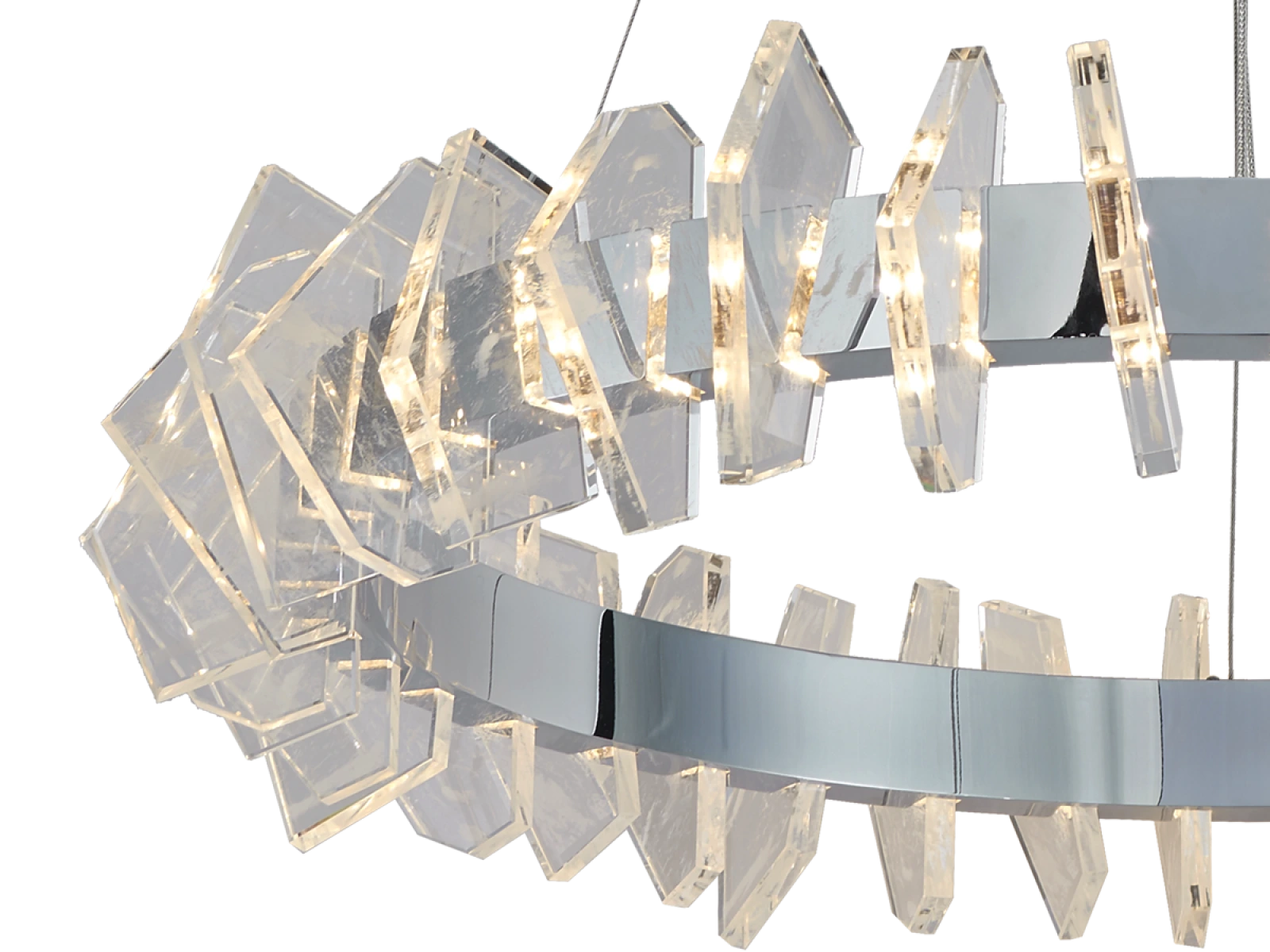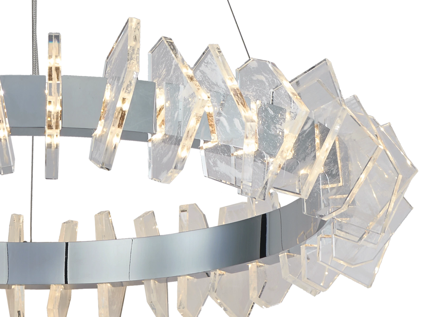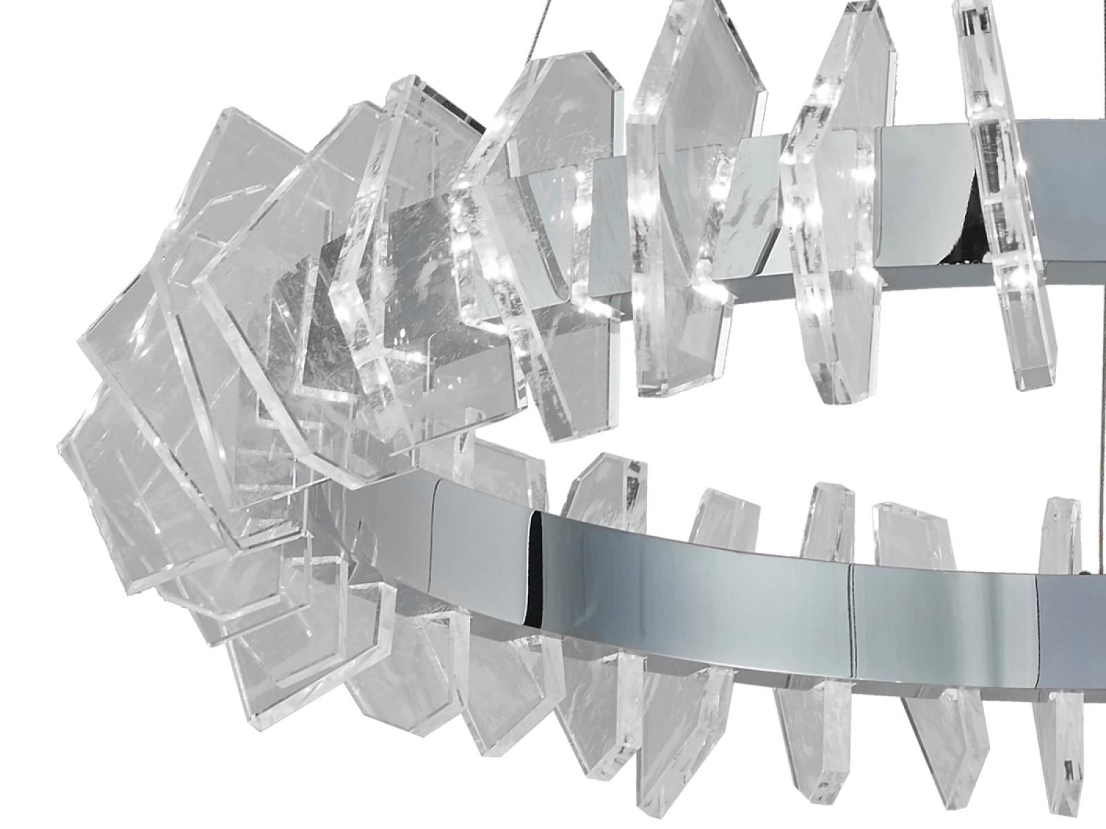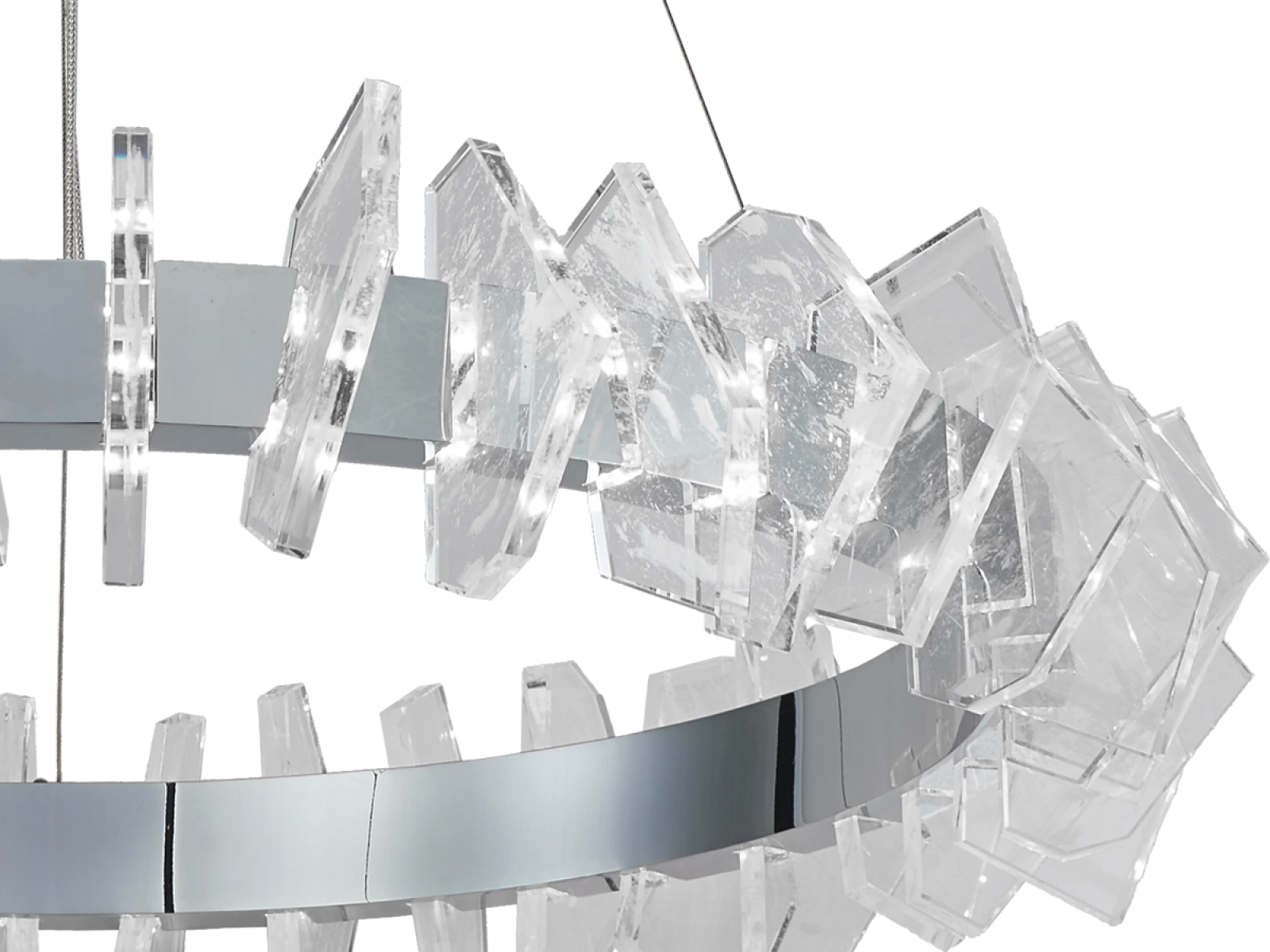 Construcția este realizată din oțel de înaltă calitate cu finisaj cromat și completată de elemente de cristal originale, tăiate cu precizie, care asigură refracția și reflectarea intensă a luminii. Rezultatul este o ambianță luminoasă luxoasă, cu un efect decorativ distinctiv, care va sublinia caracterul interioarelor moderne și reprezentative.