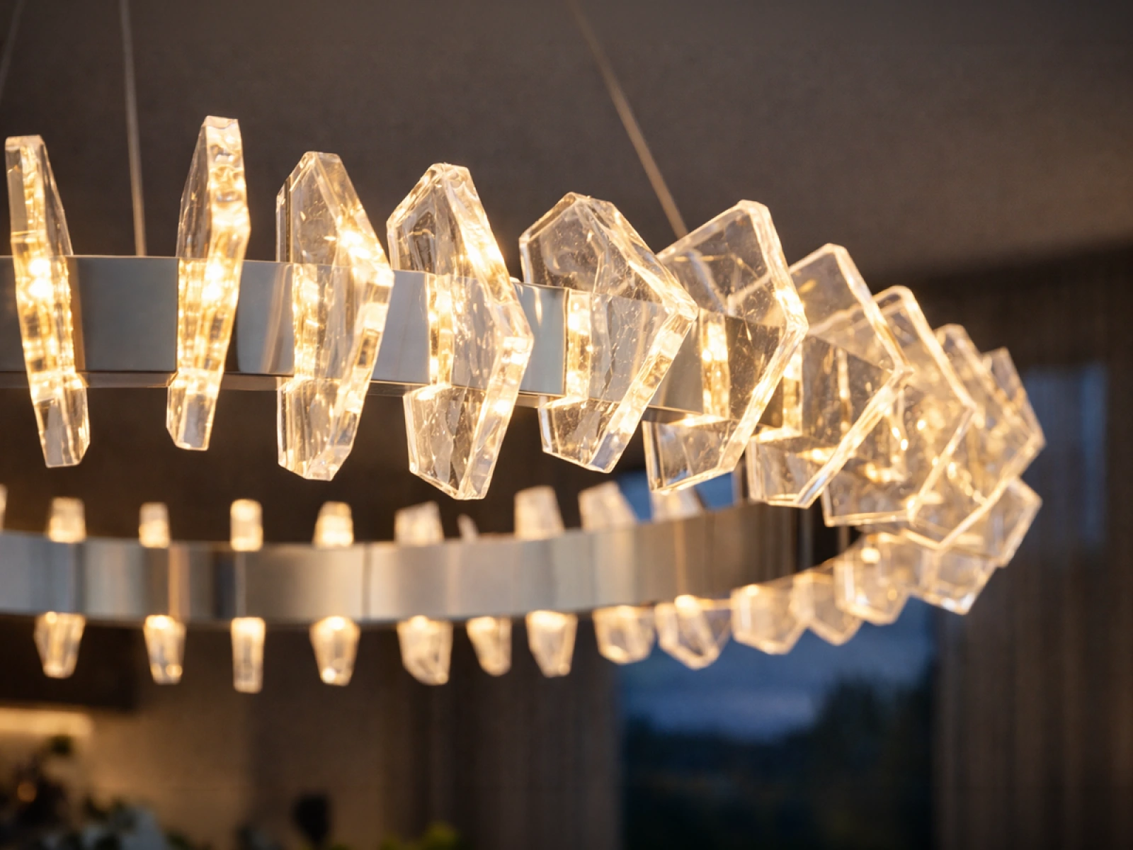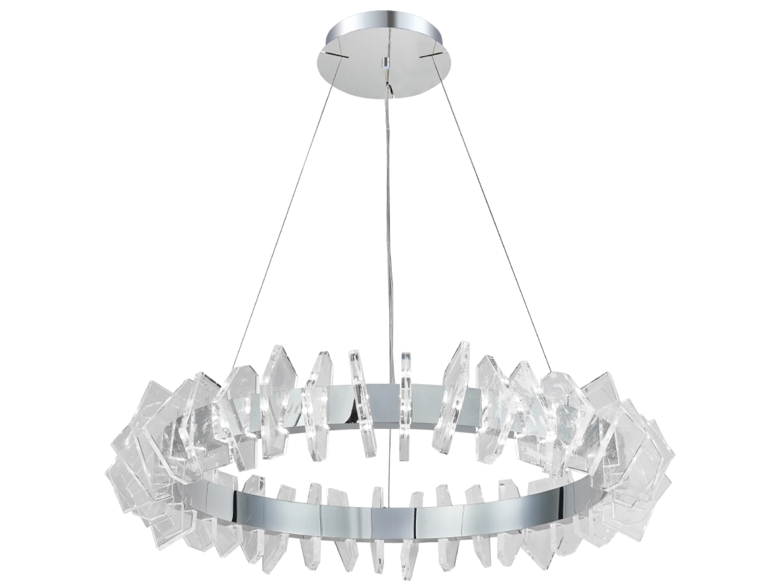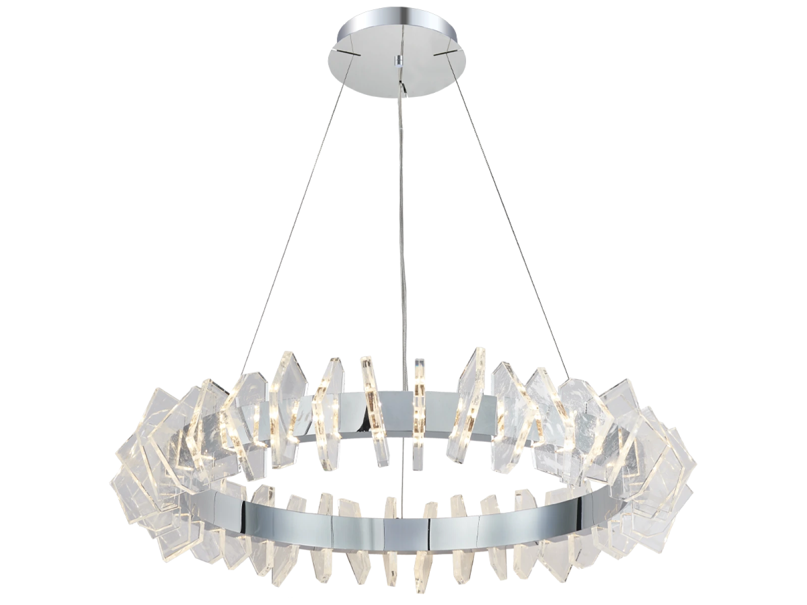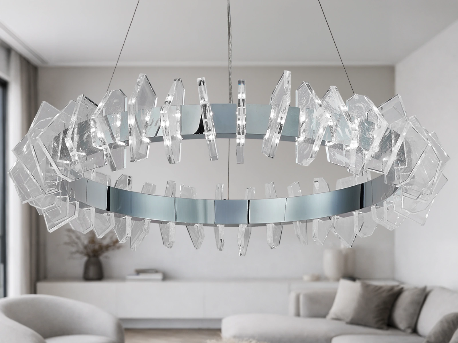 Construcția este realizată din oțel de înaltă calitate cu finisaj cromat și completată de elemente de cristal originale, tăiate cu precizie, care asigură refracția și reflectarea intensă a luminii. Rezultatul este o ambianță luminoasă luxoasă, cu un efect decorativ distinctiv, care va sublinia caracterul interioarelor moderne și reprezentative.