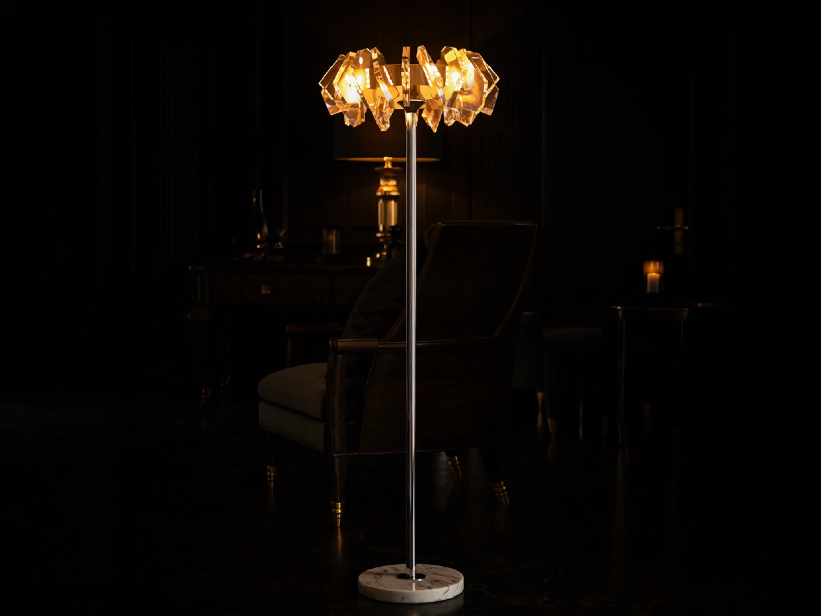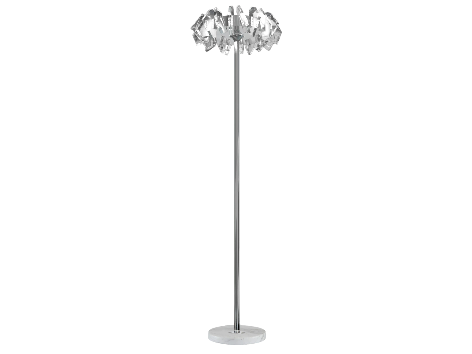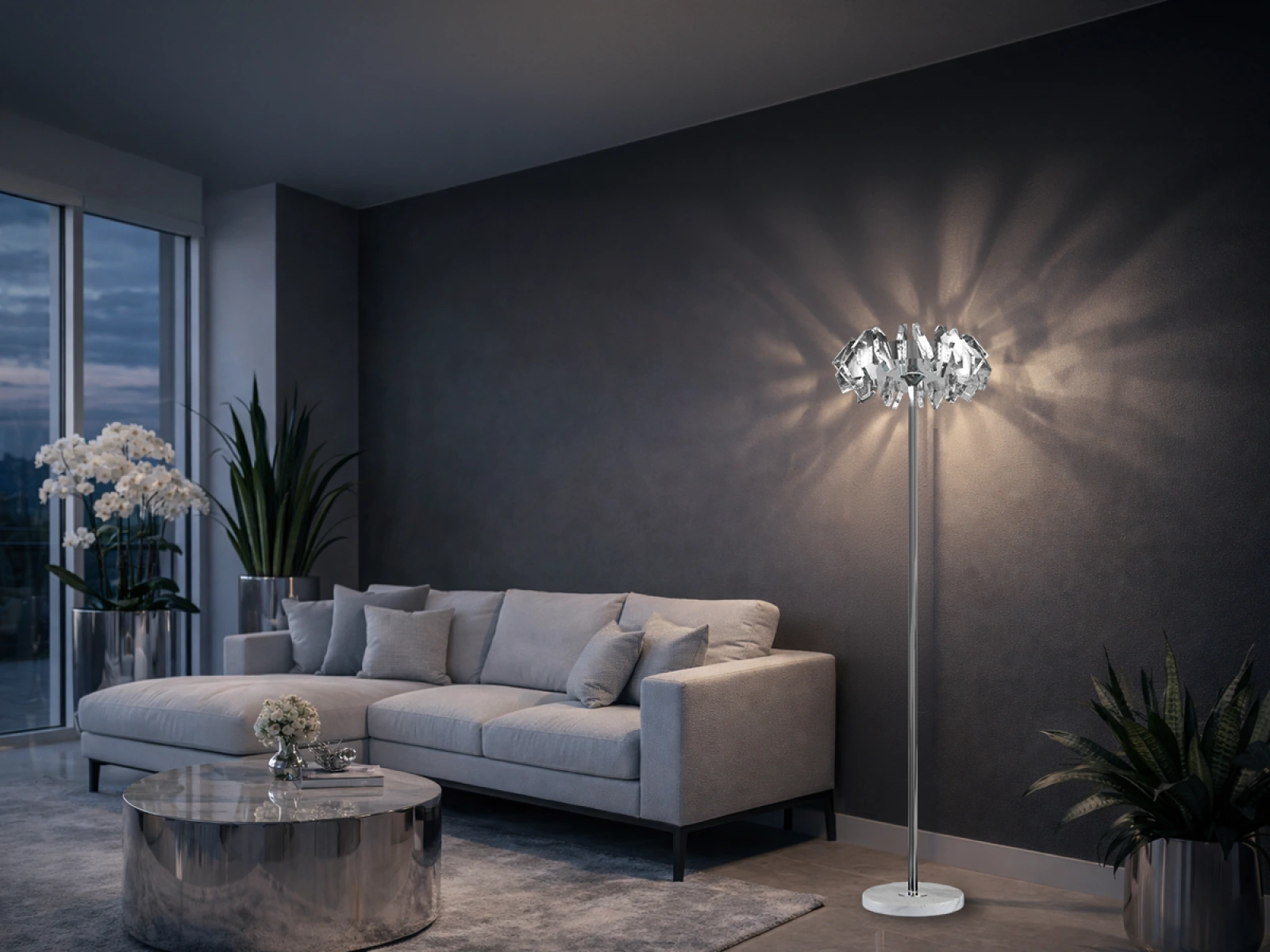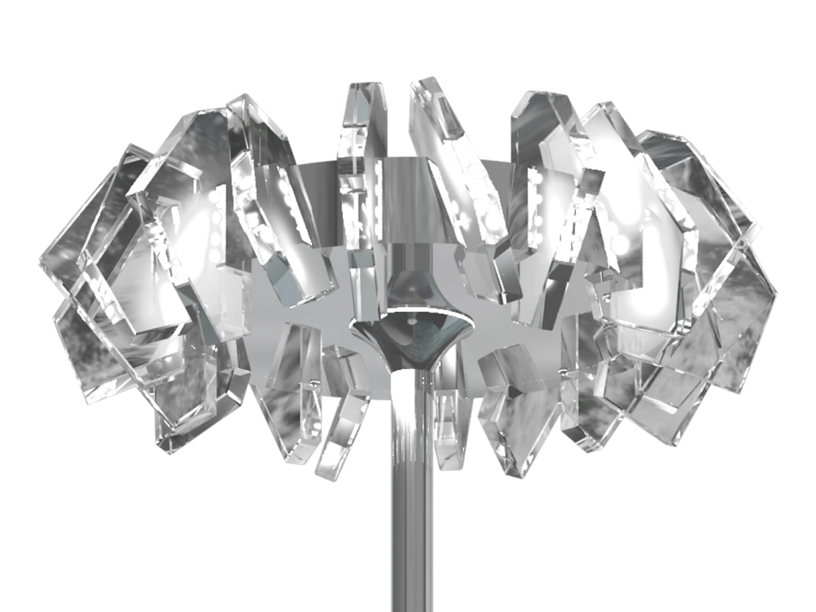 Construcția este realizată din oțel de înaltă calitate cu finisaj cromat și completată de elemente de cristal originale, tăiate cu precizie, care asigură refracția și reflectarea intensă a luminii. Rezultatul este o ambianță luminoasă luxoasă, cu un efect decorativ distinctiv, care va sublinia caracterul interioarelor moderne și reprezentative.
